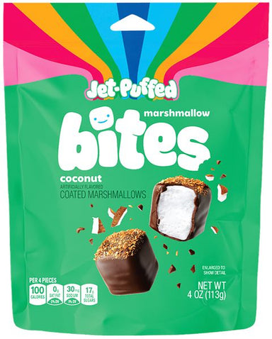 Marshmallow bites coconut flavored coated marshmallows.